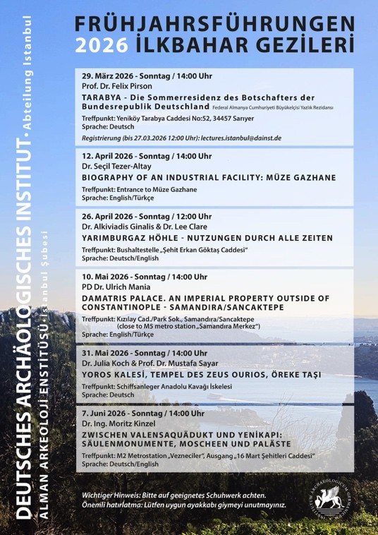 Temperatures are rising and the sun is shining – spring has arrived in Istanbul! Perfect conditions to begin spring tours and explore the historic corners of the city together. During these tours, members of the Istanbul Department will present historic monuments and districts of the city. The spring tours will begin with Prof. Dr. Felix Pirson leading a guided tour of the German ambassador's summer residence in Tarabya. The event will take place on Sunday, March 29, at 14:00 and will be held in German. Please register by March 27, 2026, 12:00 at lectures.istanbul@dainst.de. Everyone interested is warmly invited to explore Istanbul's historical sites!
