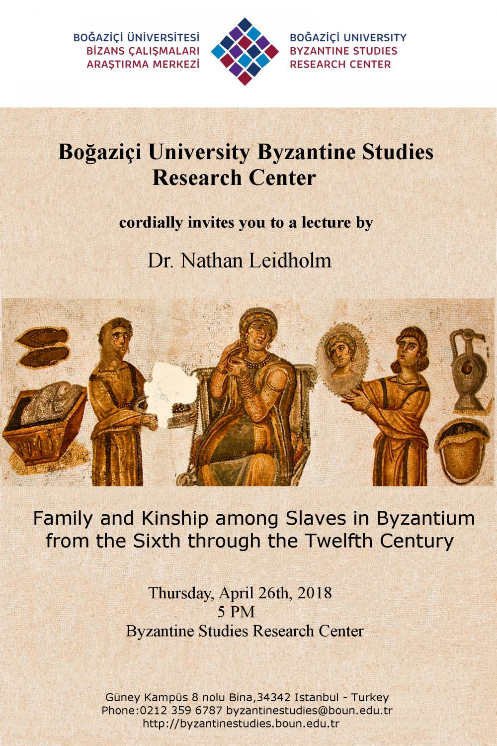 The lecture, entitled "Family and Kinship among Slaves in Byzantium in the Sixth through the Twelfth Century", has been presented by Dr. Nathan Leidholm with the participation of 30 people at the Byzantine Studies Research Center on Thursday, April 26th, 2018 at 5 PM.