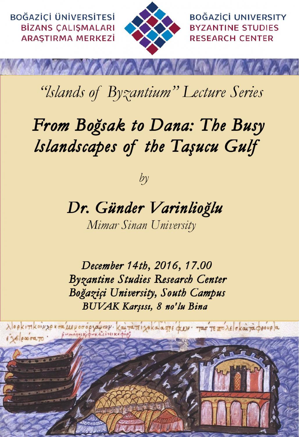 "Bizans Dünyasında Adalar" konuşma serisinin üçüncü sunumu Mimar Sinan Güzel Sanatlar Üniversitesi'nden Dr. Günder Varinlioğlu tarafından "From Boğsak to Dana: The Busy Islandscapes of the Taşucu Gulf" başlığı altında 14 Aralık 2016 Çarşamba günü Bizans Çalışmaları Araştırma Merkezi'nde gerçekleştirildi.